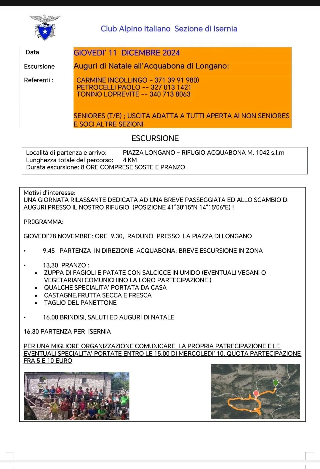 Il Gruppo Seniores della Sezione di Isernia invita tutti i soci (anche non seniores e di altre sezioni) a una giornata rilassante dedicata allo scambio degli auguri di Natale. L’appuntamento è presso il Rifugio Acquabona di Longano, un luogo accogliente immerso nei boschi del Matese. Il programma prevede una breve e facile passeggiata nei dintorni, seguita da un ricco momento conviviale per celebrare insieme le festività imminenti.